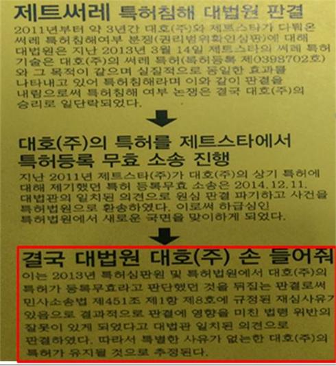 대법원에서는 대호(주)의 정정 특허에 대해 유 · 무효를 결정하지 않았음에도 대호(주)는 마치 대법원에서 승소가 확정된 것처럼 거짓 광고했다.
