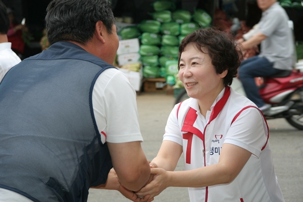 이어 권선구 농수산물시장을 방문한 정 후보는, 채소 상가에 들러 "날씨가 너무 덥죠", "요즘은 별다른 일 없으세요"라고 물으며 민원을 청취했다.