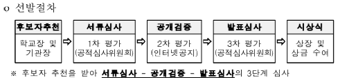 선발 대상은 대한민국 국적 소지자로 교육기관·교육행정기관·교육 연구기관에서 3년 이상 근무하고 발명교육 확산 및 발명문화 조성에 공헌한 현직 초·중·고 교원이며, 발명교육 관련 기관·단체·학회 및 소속 학교장의 추천을 받아 신청할 수 있다.