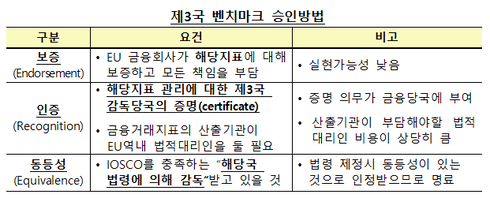 EU 승인을 받는 방식은 세 가지이나, EU 벤치마크법과 유사한 법률을 제정하는 것이 승인을 받는 가장 현실적인 방법으로 보인다.