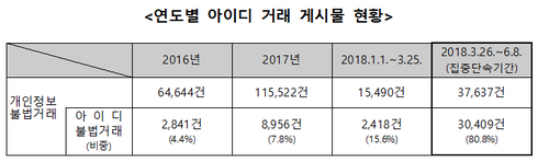 지난 3월 26일부터 6월 8일까지 탐지된 아이디 거래 게시물은 총 30,409건이며, 한국인터넷진흥원이 주요 포털과 소셜네트워크서비스 사업자 등에게 삭제를 요청하여 25,202건의 게시물이 삭제됐다.