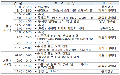 이번 행사에는 본청뿐만 아니라 현장 일선의 지방청 담당직원을 포함한 통계혁신 담당자 50여 명이 참석하여 '불필요한 일 버리기', 'ICT·데이터를 활용한 업무처리 효율화' 등을 주제로 자유토론 방식으로 새로운 아이디어를 발굴하고 구체적인 실행방안 등에 대해 논의한다.