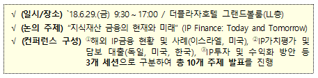 이번 컨퍼런스는 해외 IP금융 현황 및 사례, IP가치평가 및 담보대출, IP투자 및 수익화 방안 총 3개 세션으로 구성되었으며, 10여명의 국내·외 IP금융 전문가들이 실제 사례를 중심으로 주제발표와 토론을 진행했다.
