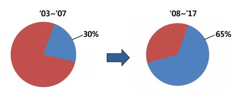 특히 지난 2008년부터 HFO계 냉매를 포함한 출원건수가 큰폭으로 증가하면서, 같은 기간의 HOF계 비중이 65%까지 증가했다.