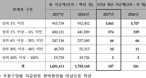 (후원수당 지급 총액) 1조 7,031억 원(’16년) ⇒ 1조 6,814억 원(’17년) 1.3% 감소, 상위 1%가 후원수당의 절반 이상(54.5%)을 받아 상위 판매원 집중현상은 지속