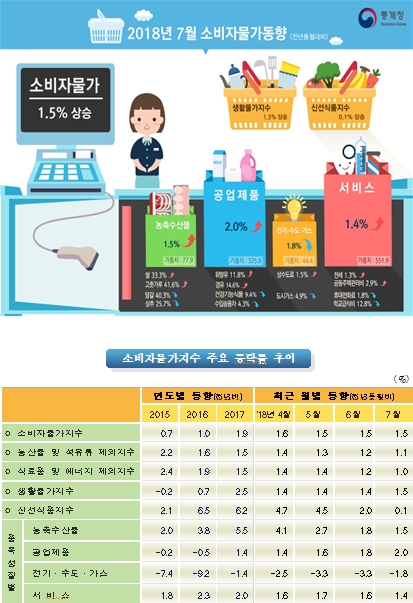 7월 소비자물가 1.5% 상승 10개월째 1%대