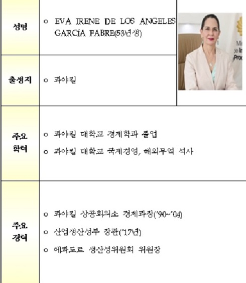 또한, 이번 양해각서 체결을 계기로 중소기업의 에콰도르 진출 활성화를 위해 투자설명회 등 양국간 다양한 협력사업도 논의될 예정이다.