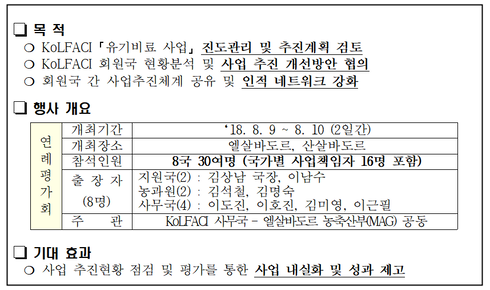 이에 지난 1년간의 성과와 사업 방향 점검을 위해 9일과 10일 엘살바도르 산살바도르에서 ‘한국-중남미 농식품기술협력협의체’ '유기비료사업'연례평가회’를 연다.