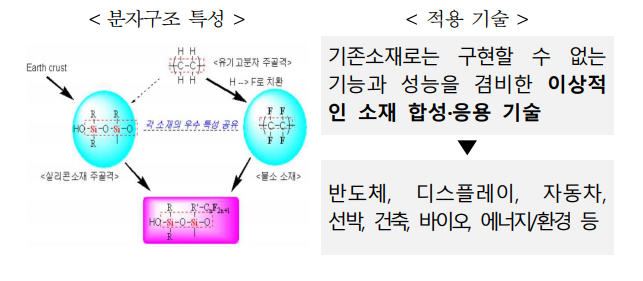 불소계 실리콘은 고온에서 높은 인장강도, 우수한 전기절연성과 내화학적 특성으로 인해 반도체 공정에서 점착제, 봉지재, 박막 등의 용도를 갖는 핵심 소재로서 성장하고 있다.