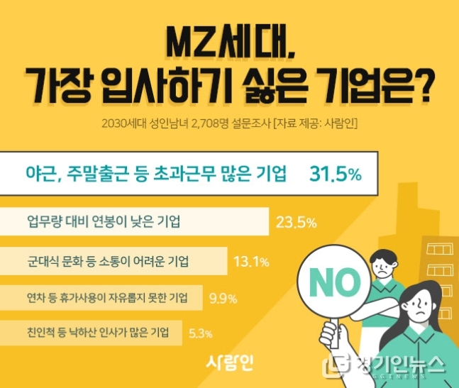 2030세대인 ‘밀레니얼 세대’와 ‘Z세대’를 아우른 ‘MZ세대’가 가장 입사를 꺼리는 기업은 ‘야근·주말 출근이 많은 기업’으로 나타났다.(사진=사람인)다음으로 △업무량 대비 연봉이 낮은 기업(23.5%) △군대식 문화 등 소통이 어려운 기업(13.1%) △연차 등 휴가사용을 자유롭지 못한 기업(9.9%) △친인척 등 낙하산 인사가 많은 기업(5.3%) △성장 기회가 많지 않은 기업(4.7%) 등의 순이었다.