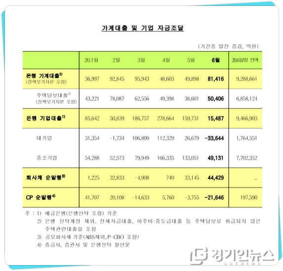 올 들어 3월(9조6000억원), 2월(9조3000억원)에 이어 세 번째로 많은 월별 증가 폭이다. 매년 6월만 놓고 보면 2004년 통계 집계 이후 최대 규모다.