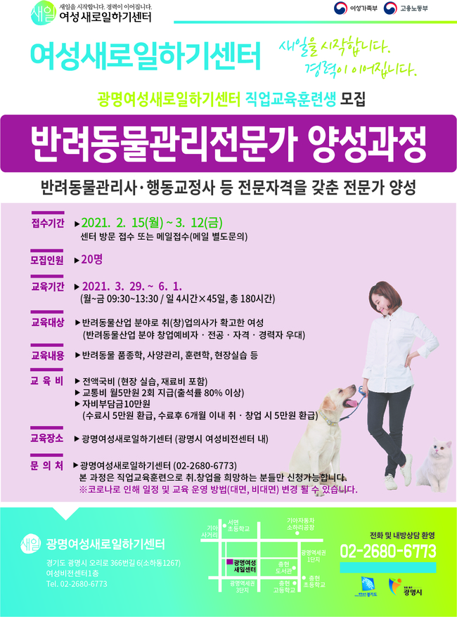 광명여성새로일하기센터는 15일부터 3월 12일까지 직업교육훈련 ‘반려동물관리전문가 양성과정’ 참여자 20명을 모집한다.