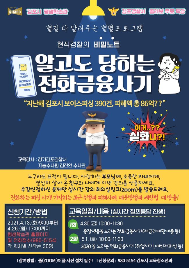김포시 평생학습관과 김포경찰서의 전화금융사기 피해예방을 위한 업무협약 관련 사업 일환으로 시민대상 특강 ‘현직경찰의 비밀노트, 알고도 당하는 전화금융사기’ 수강생을 오는 13일부터 모집한다.