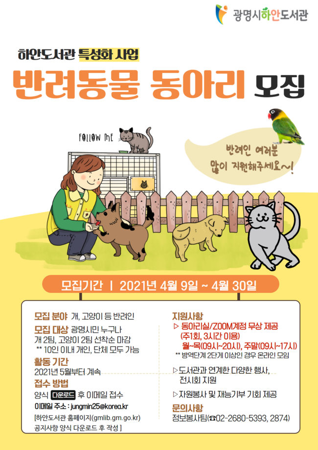 광명시 하안도서관은 `반려동물`을 주제로 도서관 특성화 사업을 추진한다.(동아리 모집 홍보문)