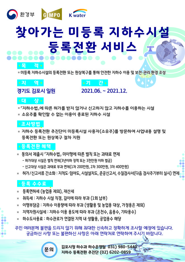 아울러, 원할한 등록전환이 이루어질 수 있도록 자진신고기간 운영에 대한 정보를 접하기 어려운 시민여러분들을 위해 찾아가는 미등록지하수 전환 사업을 병행하고 있다.