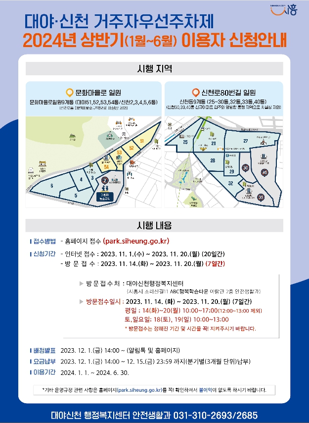 2024년 상반기 대야ㆍ신천 거주자우선주차제 신청은 인터넷 신청과 방문 신청 방식으로 진행된다. 인터넷 신청은 11월 1일부터 20일까지 대야ㆍ신천 거주자우선주차 누리집에서 가능하다. 또, 11월 14일부터 20일까지 대야ㆍ신천행정복지센터 안전생활과에 직접 방문해서 신청하면 된다.