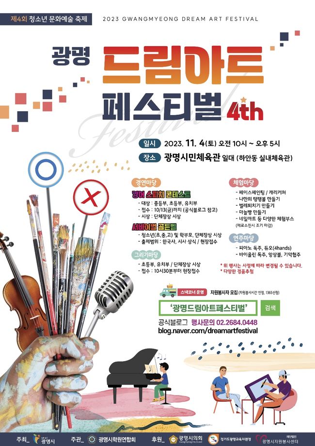 시는 오는 4일 오전 10시부터 광명시민체육관 대리석광장에서 제4회 청소년문화예술축제인 ‘광명 드림아트 페스티벌’을 개최한다고 1일 밝혔다.