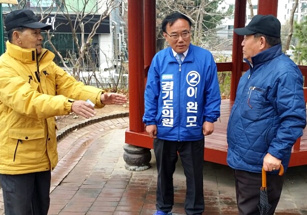 이완모 후보는 휴일을 맞아 솔밭공원에 나온 주민들과 환담을 나누며, ‘솔밭공원’을 리모델링하는 차원에서 ‘마을도서관’을 건립하겠다고 공약했다.