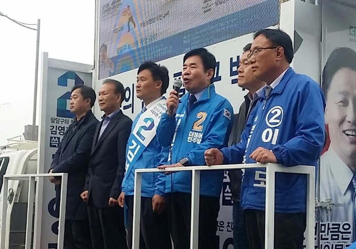 【시사인경제】이완모 수원시제5선거구(인계·행궁·지·우만1·2동) 더민주 경기도의원 후보는 선거운동 마지막 주말인 지난 9일 오후 지동시장 지동교에서 김영진, 김진표 국회의원 후보와 합동유세를 펼치며 막바지 표심을 공략했다.