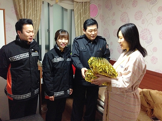 건강한 출산후 산후조리를 하고 있는 산모 백모(여, 26세)씨가 입원해있는 수원시 인계동 소재 강남산부인과를 현장에 출동했던 2명의 구급대원은 지충기 센터장과 함께 방문하여 준비한 선물을 전달하고 출산축하 인사와 태아의 건강을 기원했다.