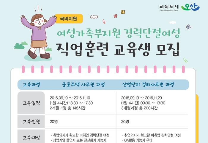 【시사인경제】오산시(시장 곽상욱)는 경력단절여성의 취업지원을 위해 ‘공동주택 사무원 과정’과 ‘산업단지 경리사무원 과정’을 오산여성새로일하기센터에서 운영한다고 9일 밝혔다.