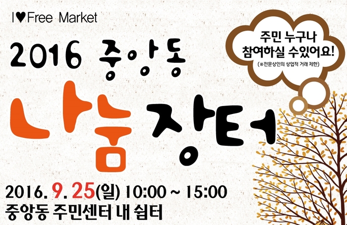 참가를 원하는 주민은 이름과 연락처, 판매·교환물품 목록을 중앙동주민센터 행정민원팀에 접수하면 된다. 참가비는 5천원이며, 초·중·고등학생은 무료다. 접수자별 장터 공간은 당일 선착순으로 배정될 예정이다.