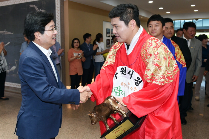 【시사인경제】수원시는 26일 시청 본관 로비에서 2016 추석 장사씨름대회와 브라질 리우 패럴림픽대회에서 우수한 성적을 거둔 선수단에 대한 환영식을 가졌다.