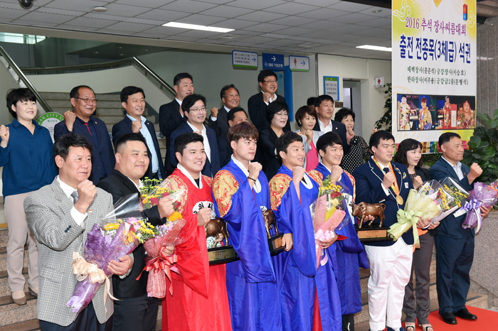 명장 고형근 감독과 이충엽 코치가 이끄는 수원시청 씨름단은 지난 17일 서울 장충체육관에서 막을 내린 2016 추석 장사씨름대회 4체급 중 태백급(80kg 이하) 문준석, 금강급(90kg 이하) 이승호, 한라급(110kg 이하) 이주용이 3개 체급을 석권하는 쾌거를 이뤘다. 또한 문형석은 금강급에서 2품에 올랐다.