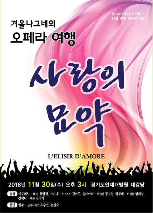 김원섭 인재개발원장은 “11월 렉처콘서트는 2016년을 마무리하는 시점을 맞아 어렵고 힘들었던 한 해를 오페라 ‘사랑의 묘약’의 따듯한 사랑과 온기로 함께 보듬는 자리”라며 “2017년도에도 많은 사람이 즐길 수 있는 다양한 주제의 문화, 예술 공연을 ‘인문학 광장’이라는 새로운 이름으로 마련하겠다”고 말했다.