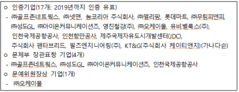 이외에도 이미 인증된 기업 중 케이티(주식회사 KT, 2012년), 벽산엔지니어링(2013년), 코리아드라이브(2013년) 등 3개를 2018년까지 추가로 재인증 승인을 했다.