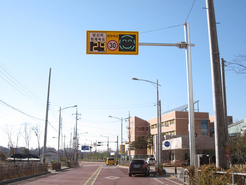 특히 이번에 생금초교에 설치한 과속경보시스템은 운전자가 규정 속도보다 과속으로 운전하면 ‘찡그리는 표정’과 ‘속도위반’이라는 문구가 표출되며, 규정 속도이하로 주행하면 ‘웃는 표정’과 ‘안전운행’으로 표시돼 운전자에게 메시지를 전달하는 대화형 시설물이다.