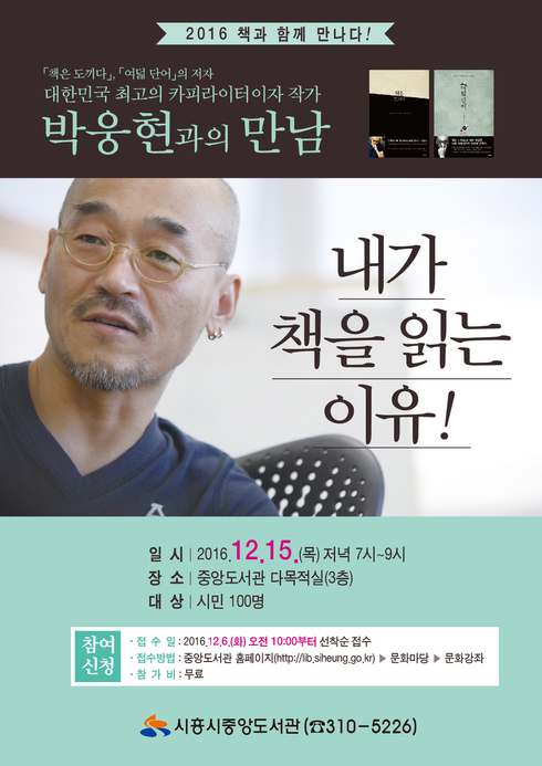 [시사인경제]시흥시 중앙도서관은 오는 15일 저녁 7시부터 중앙도서관 다목적실에서 ‘박웅현 저자와의 만남’ 행사를 운영한다고 밝혔다.