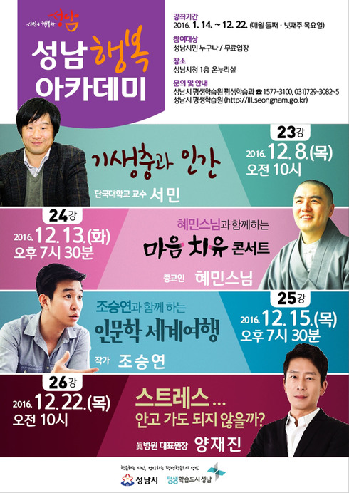 [시사인경제]성남시는 자체 설문조사에서 직접 만나고 싶은 명사로 꼽힌 혜민 스님, 조승연 작가, 양재진 원장을 차례로 초청해 시청 온누리에서 성남행복아카데미를 연다고 밝혔다.