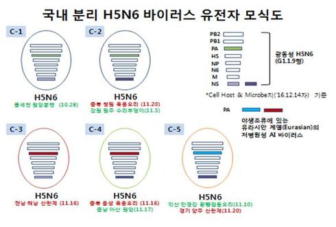 우리나라 H5N6 바이러스 중 C1형, C2형은 중국 H5N6 바이러스와 98.42∼99.93% 상동성을 보여 동일한 유전형으로 분석된다.