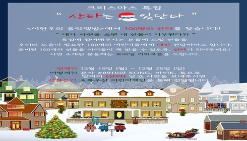 [시사인경제]KBS Cool FM ‘이현우의 음악앨범’(수도권 89.1Mhz)에서 특별한 크리스마스 특집 “산타는 있단다”를 마련한다. 방송에 사연이 소개되면 도움이 필요한 어린이들에게 선물이 기부되는 라디오 방송에서는 처음 시도하는 특별한 이벤트다.