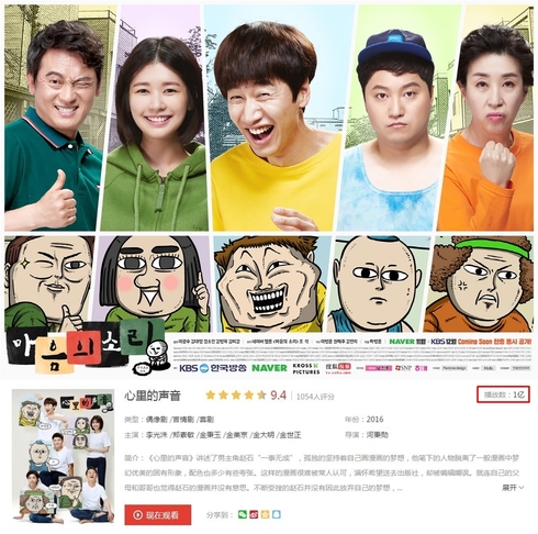 KBS 2TV 시트콤 ‘마음의 소리’(연출 하병훈/ 제작 마음의 소리 문화산업전문회사)가 지난 11월 7일 중국 소후닷컴을 통해 본편이 첫 공개된 이래 1억뷰(16.12.15기준)를 돌파하는 기록을 세우며 대륙을 핫하게 달구고 있다.