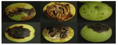 '호두나무 갈색썩음병'은 잎·열매 등에 갈색 반점이 생기거나 가지 전체가 까맣게 변하며 오그라드는 식물방역법 상 '관리 병해'로 작물에 심각한 피해를 준다.