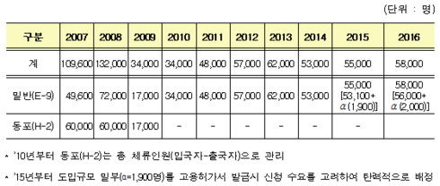 2017년 재입국자가 1만 3천명으로 예상되는 점을 감안하여 내년도 신규인력은 4만 3천명을 도입하기로 하였으며, 신규인력의 일부(2,000명)는 고용허가서 신청 수요를 감안하여 업종 간 탄력적으로 배정할 계획이다.