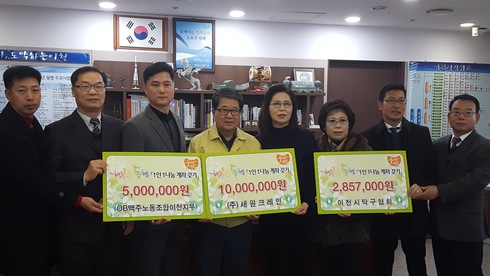 [시사인경제]이천시는 지난 26일 오전 OB맥주 노동조합이천지부, 이천시탁구협회, (주)세원크레인 등 3곳에서 어려운 이웃을 위해 사용해 달라며 각각 500만원, 약290만원, 1,000만원을 기탁했다고 밝혔다.