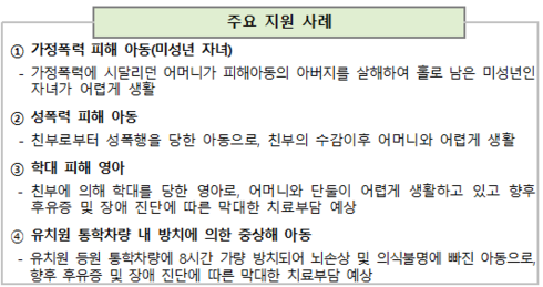 2016년 4월 20일 출범식과 더불어 성폭력피해 다문화 가정 아동 등 3명에 대해 1년간 매달 30만원씩 생계지원비 또는 학자금 지원을 결정했고, 추석명절을 앞두고 지난 9. 8. 동기없는 범죄사건의 피해자 등 6명에게 생계비 총 2,400만원을 지원했다.
