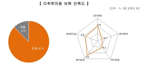 사회조사 분석결과에 따르면 미취학아동 보육 만족도는 『만족』이 87.4%로, 이는 경기도 평균인 75.3%보다 10%이상 높은 수치다. 성별로 보면 여자 가구주(93.6%)가 남자 가구주(86.2%)보다 만족하는 비율이 더 높았으며, 연령대별로 보면 미취학아동이 가장 많은 30대의 만족하는 비율은 83.6%로 나타났으며, 40대는 88.5%로 나타났다.