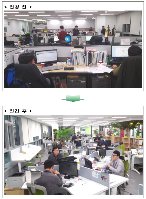 | 부서간 벽을 없애고 개인간 칸막이를 낮추어 개방적인 공간으로 조성 |