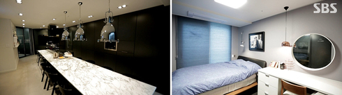 대리석 두 개를 이어붙인 식탁의 길이는 자그마치 5.6M에 달하는데, 덕분에 이곳에서 아내의 베이킹 수업도 이루어질 수 있다고 한다. 또한, 비밀의 공간도 존재한다. 밖에서 보면 수납장이지만 문을 열면 다용도실이 나타나는데, 시크한 집을 위해서는 색뿐만 아니라 수납에도 신경을 쓸 수밖에 없었다고. 이 공간이 있어서 자질구레한 물건들을 전부 숨겨 놓을 수 있었다고 한다.