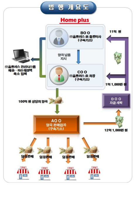 [시사인경제]부산지방검찰청 형사2 (부장검사 유병두)는, 양곡대금을 변제할 의사나 능력 없이 (주)홈플러스를기망하여위회사소유의양곡 100억 원 상당을 납품받고, 그 과정에서 양곡 덤핑판매 묵인 및 미수채권액 은닉의 대가로 (주)홈플러스 직원 2명에게 차명계좌로 합계 12억 1,000만 원을 공여하고, 차명계좌로 입금된 위 배임증재액이 마치 공사대금을 지급한 것처럼 가장한 양곡판매업자 A○○(55세)을 특경법위반(사기), 특경법위반(배임), 배임증재죄, 범죄수익은닉죄로 구속기소하고, A○○으로부터 위 양곡 덤핑판매 묵인 및 미수채권액은닉을 해준 대가로11억을 수수하고, (주)홈플러스 소유의물품대금을횡령한(주)홈플러스前 총괄이사 B○○(50세)을 특경법위반(배임), 배임수재, 업무상횡령죄로 구속기소하고, A○○으로부터 위 양곡 덤핑판매 묵인 및 미수채권액 은닉을 해준 대가로1억 1,000만원을 수수하고, B○○이 위 11억 원을 수수함에 있어 A○○과 B○○ 사이의 의사연락을 중개한 (주)홈플러스 前 차장 C○○(45세)을 특경법위반(배임), 배임수재, 배임수재방조로 구속기소(‘16.12.28.)하고, B○○, C○○에게 배임수재를 위한 차명계좌를 제공하고, 위 배임수재액이 마치 A○○으로부터 공사대금을 입금 받은 것처럼 가장한 건설업자 D○○(42세)을 배임수재방조, 범죄수익은닉죄로 불구속 기소했다고 밝혔다.