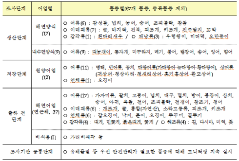 조사대상은 우선 소비자가 선호하고 즐겨 먹는 고등어, 명태, 갈치, 넙치, 오징어 등 다소비 대중성 품종과 최근 3년 동안 부적합 발생 이력이 있는 품종 등 특별관리 대상 수산물과 오염 우려가 있는 해역(지역)에서 생산된 수산물 등이다.