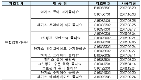 유한킴벌리가 제조·생산하는 12개 물휴지 중 판매중지된 10개를 제외한 2개 품목(‘크리넥스 맑은 물티슈’와 ‘크리넥스 수앤수 라임물티슈’)은 기준에 적합했다.