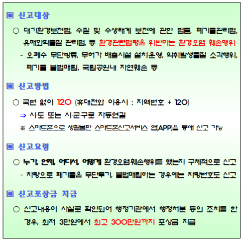 특히 ‘환경오염행위 신고창구’를 운영하여 국민 누구나 환경오염행위를 발견하면 국번없이 120로 전화(휴대전화의 경우는 지역번호와 함께 120번)하여 신고하도록 했다.