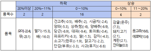 중순 현재 주요 품목의 가격이 안정세를 보이고 있으나, 배추, 무, 양배추, 당근 등 노지채소와 계란 등은 평년에 비해 높은 상황이다.