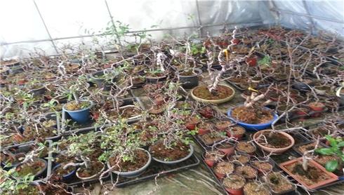 | 고사가 진행 중인 명자나무 분재를 모아 놓은 모습 |