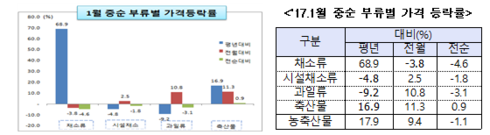 [시사인경제]농림축산식품부는 1월 중순 현재 평년대비 부류별 농축산물 물가 동향을 분석한 결과 시설채소, 과일류는 평년대비 낮고, 노지월동채소와 AI발생 피해가 있는 축산물은 다소 높은 것으로 나타났다고 밝혔다.